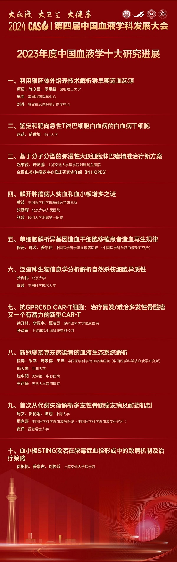 “中国血液学十大研讨停顿”挑选勾当由中国血液学科成长大会倡议,自2020年起头,至今已成功举行四届,旨在记实、揭示和宣扬我国血液学研讨范畴的严重迷信停顿和标记性功效,揭示我国血液学研讨气力和学术程度,鼓励血液学范畴医师和泛博科技任务者进一步勇担任务、寻求出色,增进公家懂得、关怀和撑持血液学研讨,在全社会营建杰出的迷信空气。